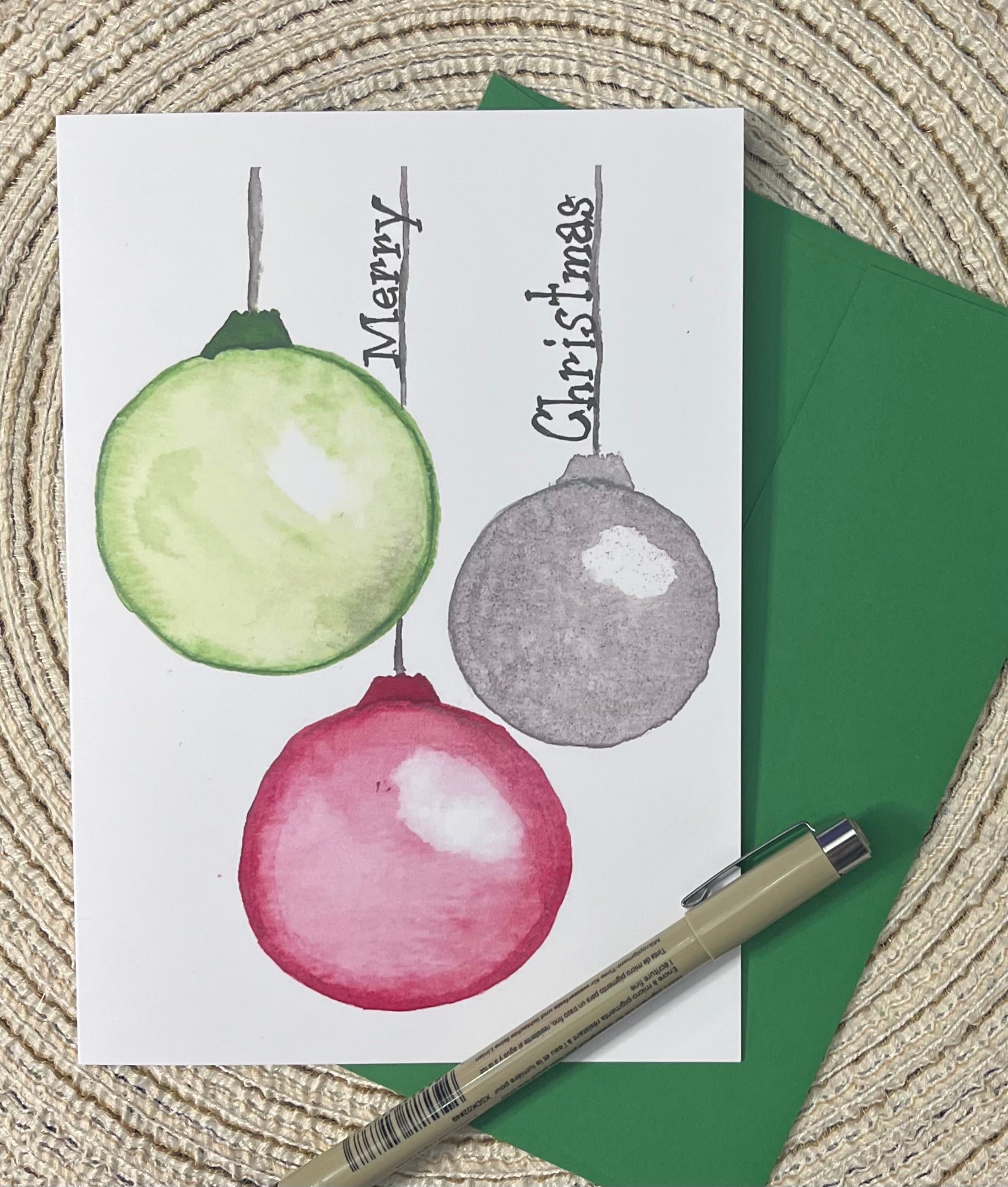 Spread holiday cheer with this delightful 5x7 Christmas card featuring whimsical watercolor ornaments in traditional festive hues. Each card arrives with a coordinating envelope, printed on premium quality paper that feels as special as your message. Perfect for sharing warm wishes and "Merry Christmas" greetings with loved ones. Make your seasonal correspondence memorable with this charming, artfully designed card that captures the magic of the holidays.